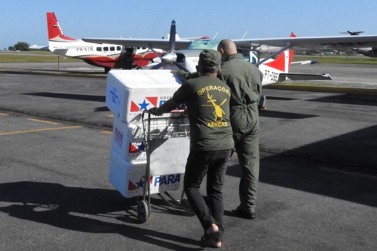 Nesta quarta-feira (18), a cidade de Cametá recebeu mais uma remessa de imunizantes contra a Covid-19 que irá abastecer também os demais municípios localizados na região do Baixo Tocantins. O Grupamento Aéreo de Segurança Pública (Graesp), vinculado à Secretaria de Segurança Pública e Defesa Social do Pará (Segup), realiza mais uma vez a rota para levar as vacinas, de forma rápida e segura, para atender aos municípios mais distantes da Capital do Estado..