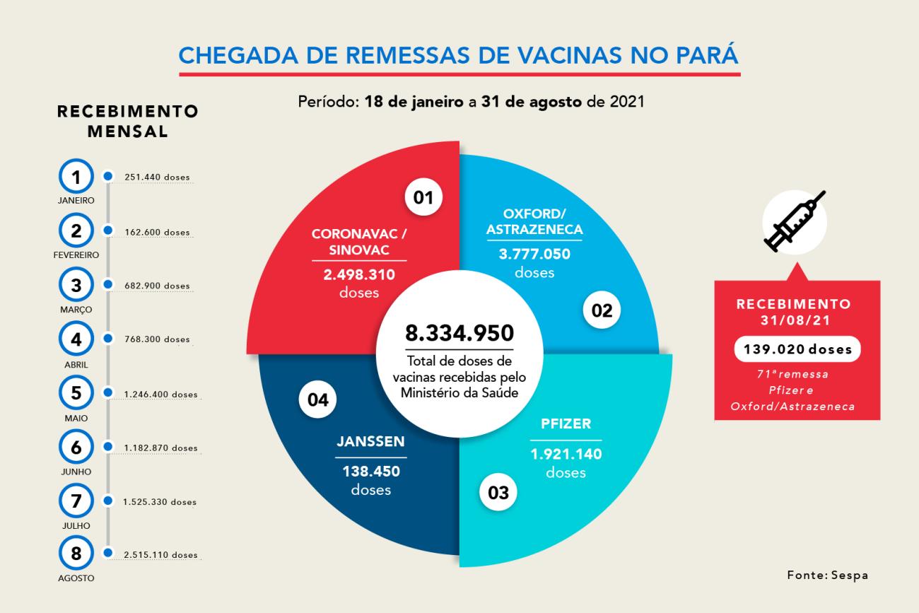 Ao todo, o Pará já recebeu 8.334.950 doses de imunizantes destinados à população paraense, das quais 2.498.310 são da CoronaVac/Sinovac; 3.777.050 da Oxford/AstraZeneca; 1.921.140 da Pfizer e 138.450 da Janssen.