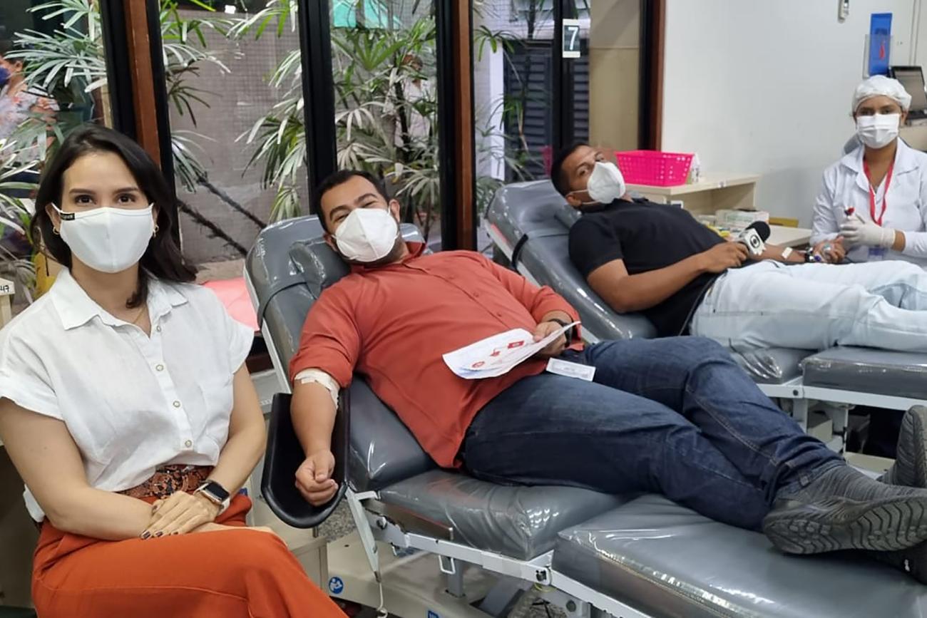 Cidadania - Para a coordenadora de Eventos, Web e Relacionamento com os Telespectadores da TV Liberal, Tathyana Cardoso, essa é mais uma parceria com a Fundação Hemopa que visa reforçar o estoque de sangue na hemorrede paraense, frente ao cenário da pandemia de Covid-19, para atender também pessoas acometidas por outras doenças e que precisam de transfusão.Thayse Assis, Luciano Cuns (c) e Carlos Brito ajudaram a melhorar o estoque de sangue da hemorrede no Pará