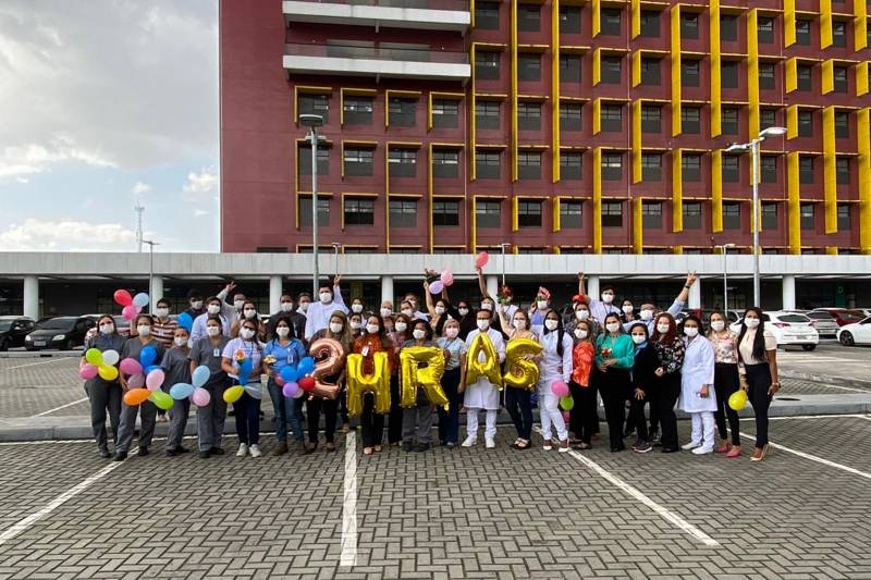 Gratidão - A técnica em Enfermagem Maria Estelita Araújo, 51 anos, relembrou a época de pico da pandemia. “É muito gratificante trabalhar aqui, apoiar quem precisa. Nossa atuação nas duas ondas da Covid me marcou muito. Fomos praticamente a segunda família dos pacientes que ficaram internados no ‘Abelardo’. Me realizo trabalhando no HRAS”, frisou.Profissionais em frente ao Hospital Abelardo Santos, instituição que já se tornou referência em atendimento na rede pública