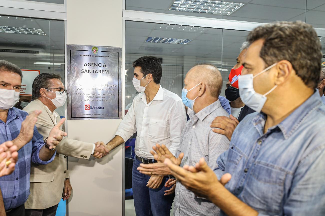 Governador Helder Barbalho cumprimenta o presidente do Banpará, Braselino Assunção, no ato de entrega de mais uma agênciaMais de 50 anos após a chegada do Banco do Estado do Pará (Banpará) a Santarém, no oeste paraense, o município passa a contar com a segunda agência, dessa vez no bairro Santíssimo, um pouco mais distante do centro da cidade. A agência foi entregue à população nesta quinta-feira (30), pelo governador Helder Barbalho.