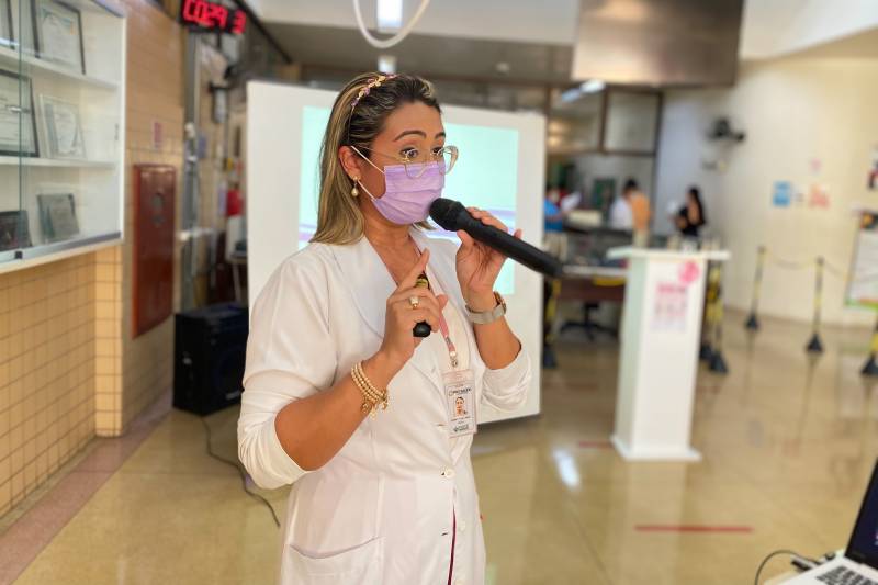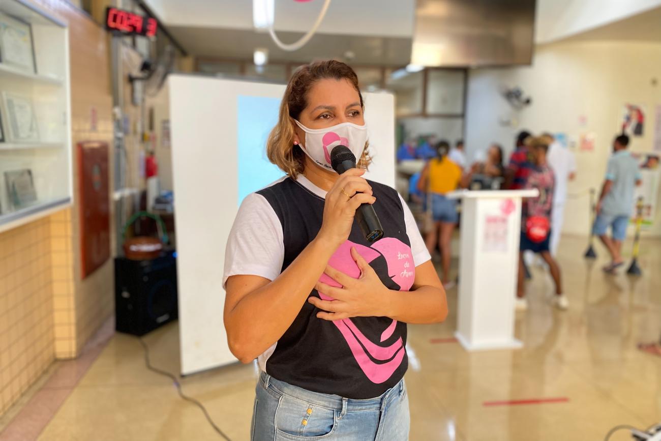 Paciente Gemille Sales compartilha suas vivênciasEm alusão à campanha nacional Outubro Rosa, que visa à prevenção e conscientização sobre o câncer de mama, o Hospital Metropolitano de Urgência e Emergência (HMUE), em Ananindeua (Região Metropolitana de Belém), promoveu na segunda-feira (25), a palestra “Câncer de Mama: mitos e verdades”, ministrada pela médica oncologista Jamily Rocha, para acompanhantes de pacientes internados na unidade hospitalar.