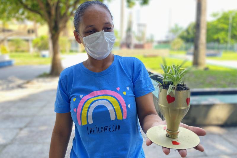 As mudas plantadas são produzidas no próprio Hospital Metropolitano. Cirleia Ramos da Silva, 42, veio de Uruará, interior do Pará, acompanhar o irmão que, há mais de um mês, está internado, e participou da atividade. “É muito bom para que a gente esqueça um pouco do medo e da aflição que é ver a pessoa que a gente ama em uma situação complicada. Neste momento, a gente até consegue relaxar e ter calma para entender a situação”, diz Cirleia.