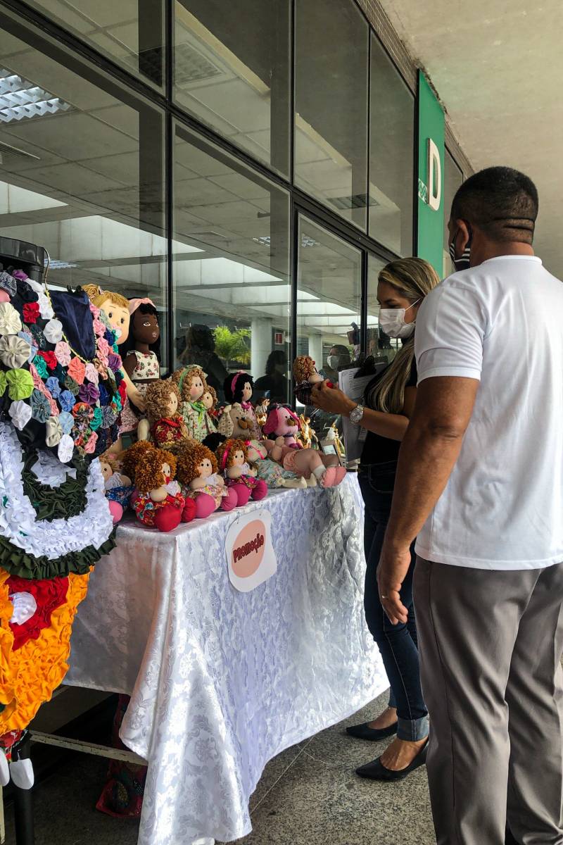 Ao circular pela calçada da unidade, colaboradores e pacientes se depararam com bonecas de pano, tapetes, laços, costura criativa e produtos de biscuit. “Achei muito legal esse projeto. Além de peças lindas, criativas e bem confeccionadas, é uma oportunidade em meio ao desemprego, principalmente para quem tem alguma doença. Eu sei bem disso”, disse Iara Gomes, 56 anos, que no HRAS, faz tratamento vascular.