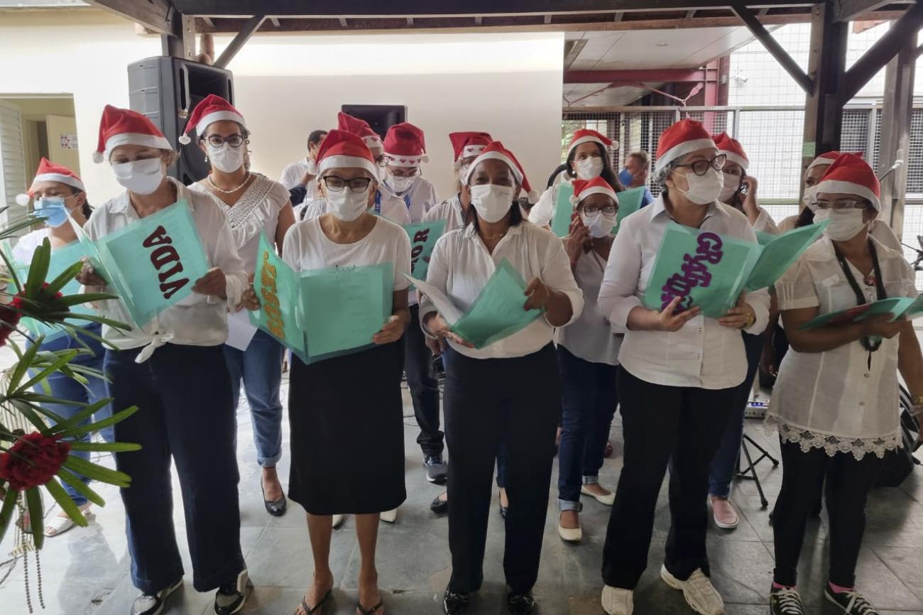 Desde 2020, o “Espaço Acolher” promove atividades artesanais, lúdicas e de musicalidade. A estratégia de enfrentamento à doença promove uma mudança no ambiente terapêutico, tornando-o mais divertido, descontraído e humanizado, favorecendo um melhor apoio ao tratamento. A Oncologista Clínica e a coordenadora da quimioterapia, Danielle Feio, a coordenadora do “Espaço Acolher”, Zoê Cotta; e as assistentes sociais Eulália Martins e Laudilene Pantoja foram as principais organizadoras do evento e conseguiram levar emoção com a programação natalina.Formado por pacientes do 'Ophir Loyola', acompanhantes e servidores, o Coral cantou e encantou com músicas natalinas e louvores