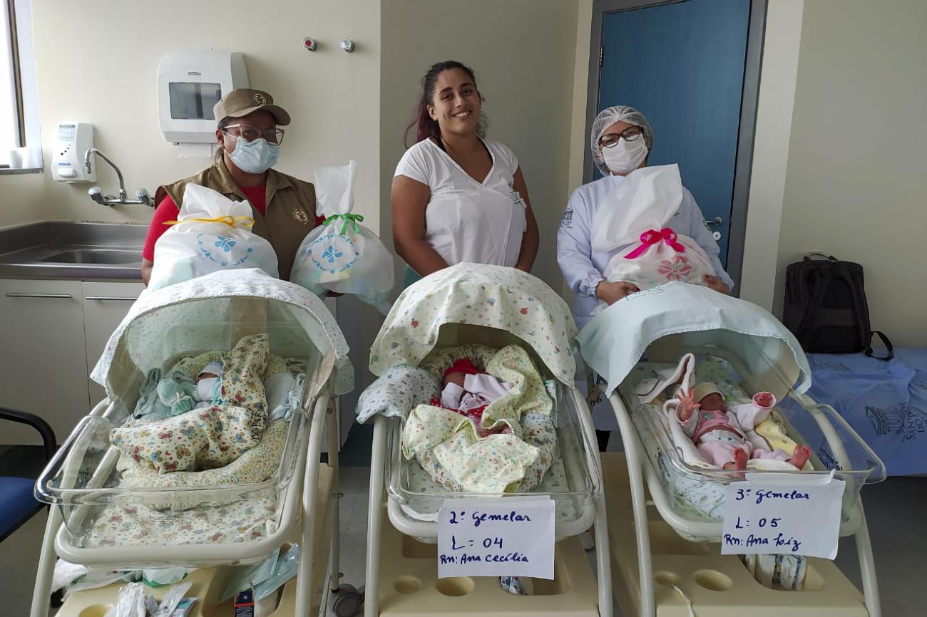 Entregues por uma doadora anônima, as roupinhas e fraldas para os recém nascidos foram organizadas em kits pelas voluntárias do projeto Bombeiros da Vida e entregues às mães internadas no Unidade de Cuidados Intermediários Cangurú, do setor de neonatologia da Santa Casa.
