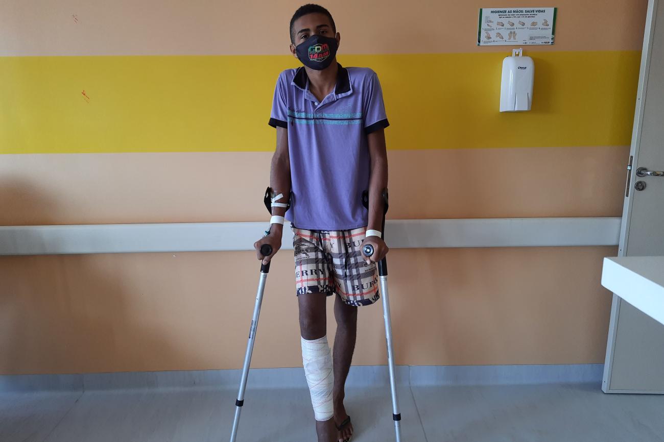 Vítima de acidente de trânsito, Vinicius da Assunção de Oliveira, 17 anos, é um dos usuários internados com fratura na tíbia. Em tratamento, o adolescente usa muleta canadense, que vem auxiliando na locomoção na parte interna do Hospital. “A muleta está me ajudando para execução de necessidades diárias, como ir ao banheiro sozinho e sair do quarto para o setor de fisioterapia”, ressaltou o usuário, que reside em Ourém, a cerca de 50 quilômetros de Capanema.
