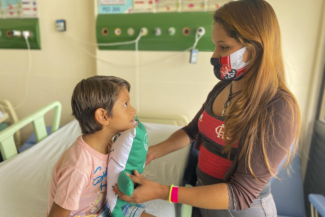 Entre os pequenos pacientes que receberam um novo amiguinho está Diego Santos da Silva, 5 anos, internado há uma semana no Hospital Metropolitano, após sofrer um acidente em casa, no município de Cachoeira do Piriá, na região Nordeste, a mais de 200 km de distância da capital paraense.