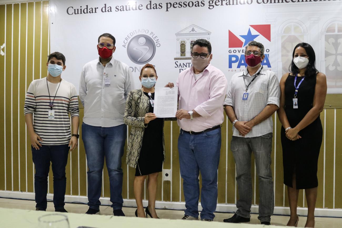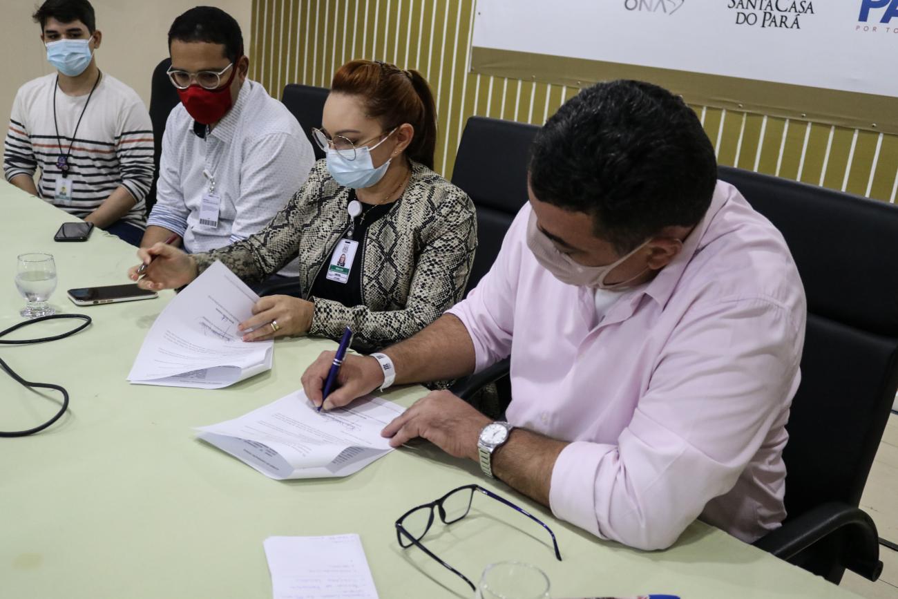 Representantes da Fundação Santa Casa de Misericórdia do Pará (FSCMP), Secretaria Municipal de Economia (Secon), Serviços Nacional de aprendizagem Comercial (Senac) e da Faculdade Cosmopolita, além de trabalhadores ambulantes da área do entorno da Santa Casa participaram, nesta quinta-feira (13), da assinatura do Termo de Cooperação do Projeto Calçada Legal.
