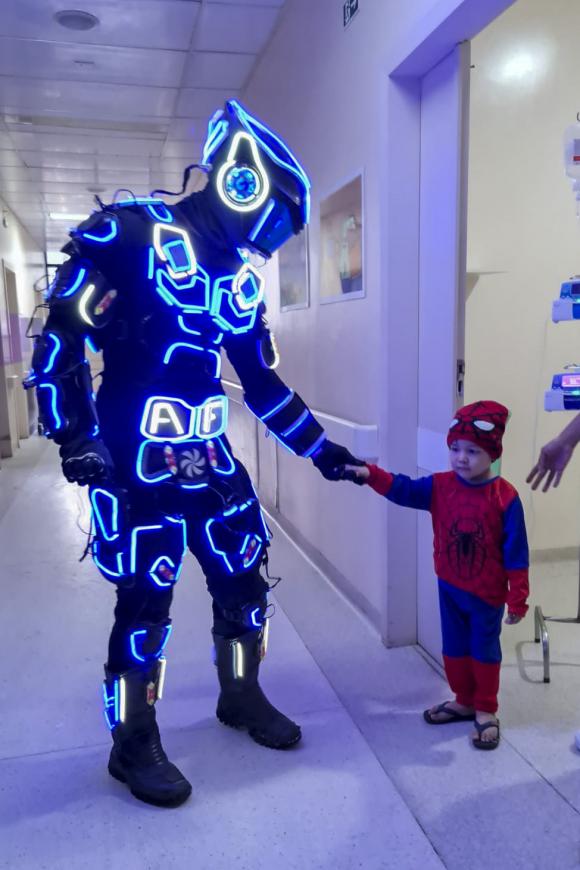 Para intensificar o colorido do evento carnavalesco, a inovação marcou presença com outra participação voluntária: a dos robôs futuristas da Anime Fest, com suas luzes neon reluzentes. Eles passaram pelos corredores de todas as unidades de internação do hospital.