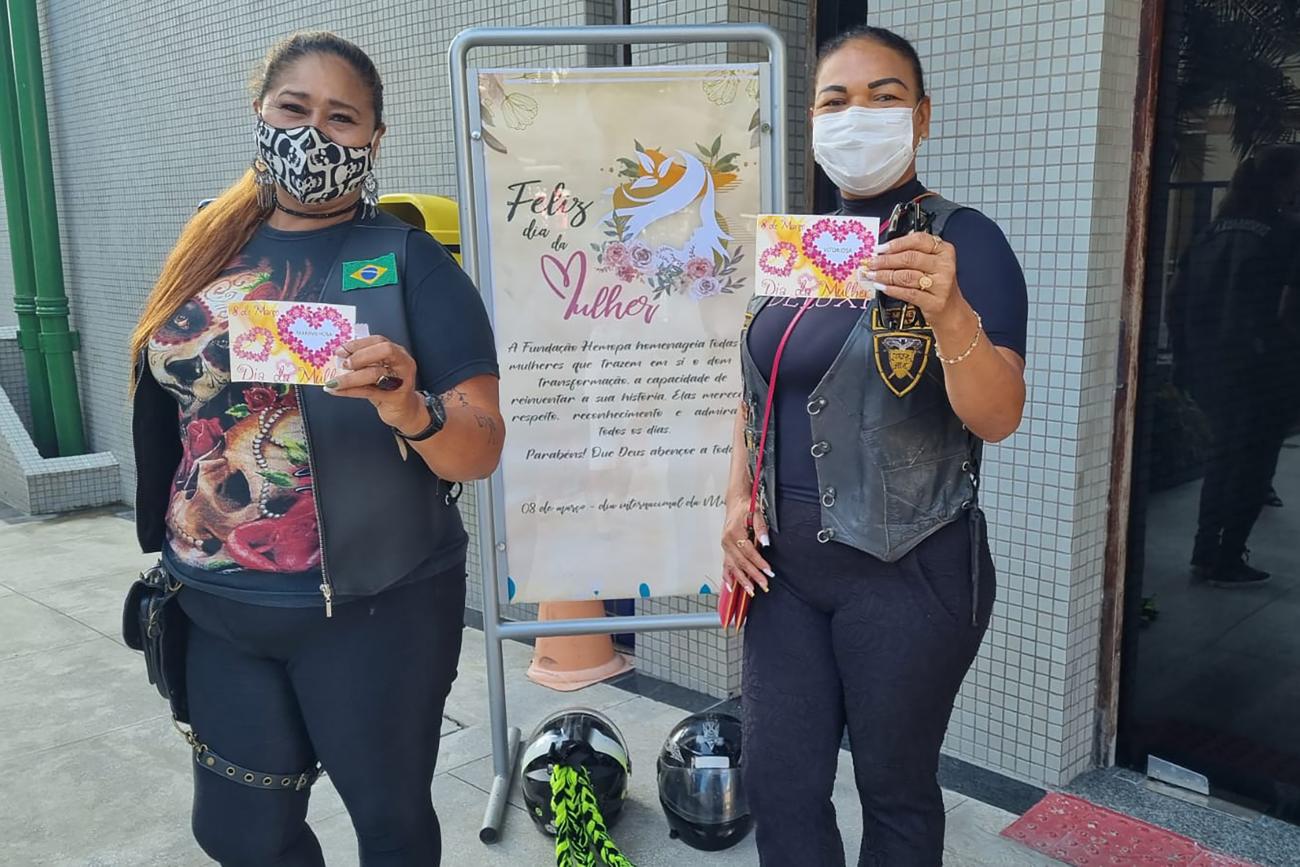As motociclistas Sonia Meneses e Rosiane Silva compareceram na unidade de coleta para fazer parte da corrente solidáriaDia da Mulher - Neste dia 8, as motociclistas Sonia Meneses e Rosiane Silva compareceram na unidade de coleta para fazer parte desta corrente solidária. “Sou doadora desde os 18 anos. E nós somos bem unidos, um motoclube aciona o outro para ajudar em qualquer urgência. Sempre tem pessoas que a gente conhece que pede ajuda também e nós estamos prontos para vir aqui e doar”, destacou Rosiane.