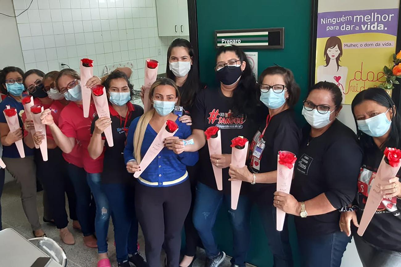 Grupo de mulheres voluntárias na doação de sangue no Hemopa, em Capanema, com as rosas recebidas neste Dia da MulherServidora da Fundação Hemopa há 16 anos, Antônia Pinheiro é técnica de Enfermagem e trabalha no setor de Coleta de Sangue no Hemopa, em Capanema. Mas a história dela com a causa da doação de sangue não começou aí.