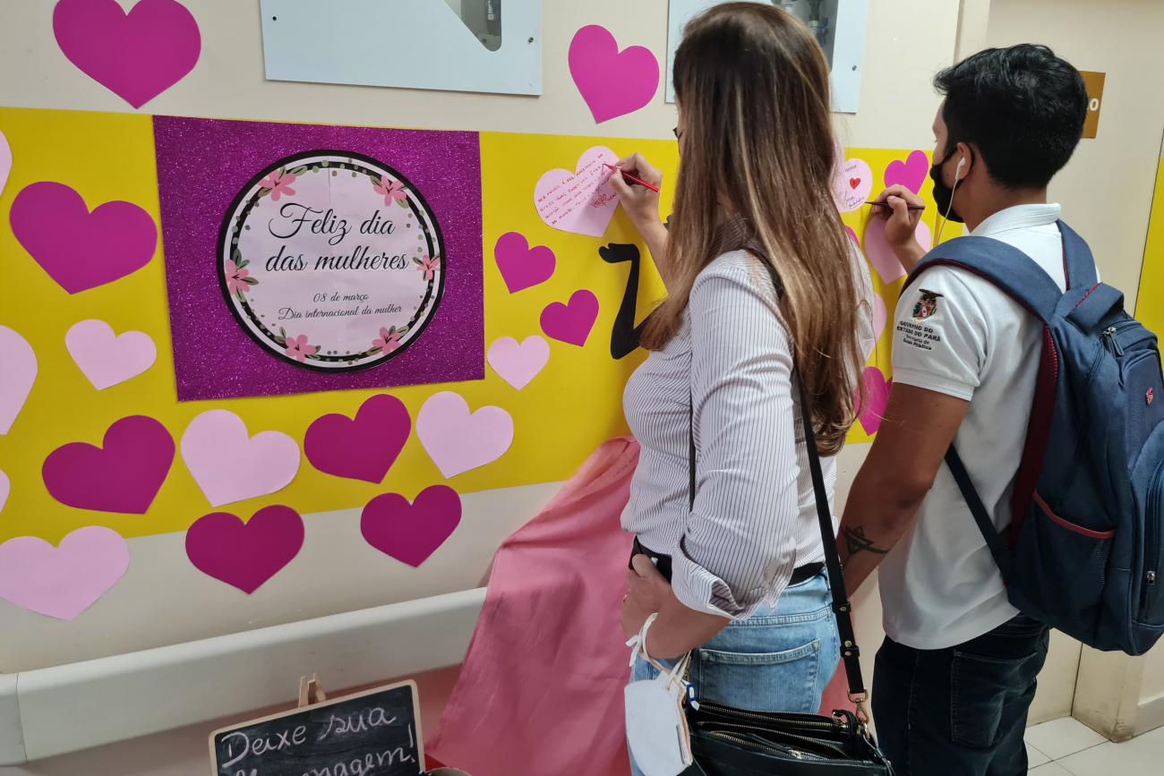 Colaboradores escreveram mensagens às mulheres em mural no HOIOLNa quinta-feira (10) e sexta-feira (11) serão realizadas edições especiais, em diferentes turnos, do Projeto "Karaokê dos Heróis" e rodadas de jogos, exclusivamente para mulheres.