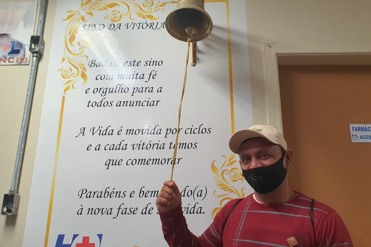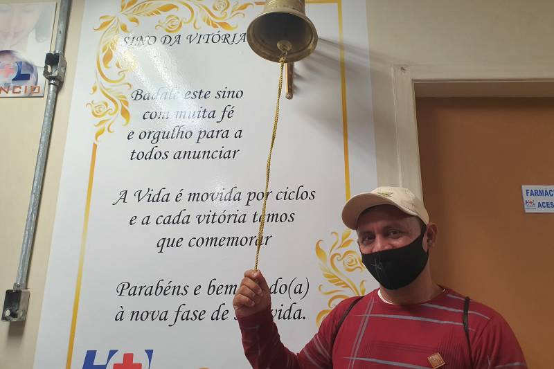 “Sino da Vitória. Badale este sino com muita fé e orgulho para a todos anunciar. A vida é movida por ciclos e a cada vitória temos que comemorar. Parabéns e bem-vindo (a) à nova fase de sua vida”, afirma a poesia que acompanha o instrumento fixado na parede do setor. Lida em um coro improvisado por usuários e acompanhantes, a mensagem tornou-se, assim como o sino, sinônimo de gratidão e fé.