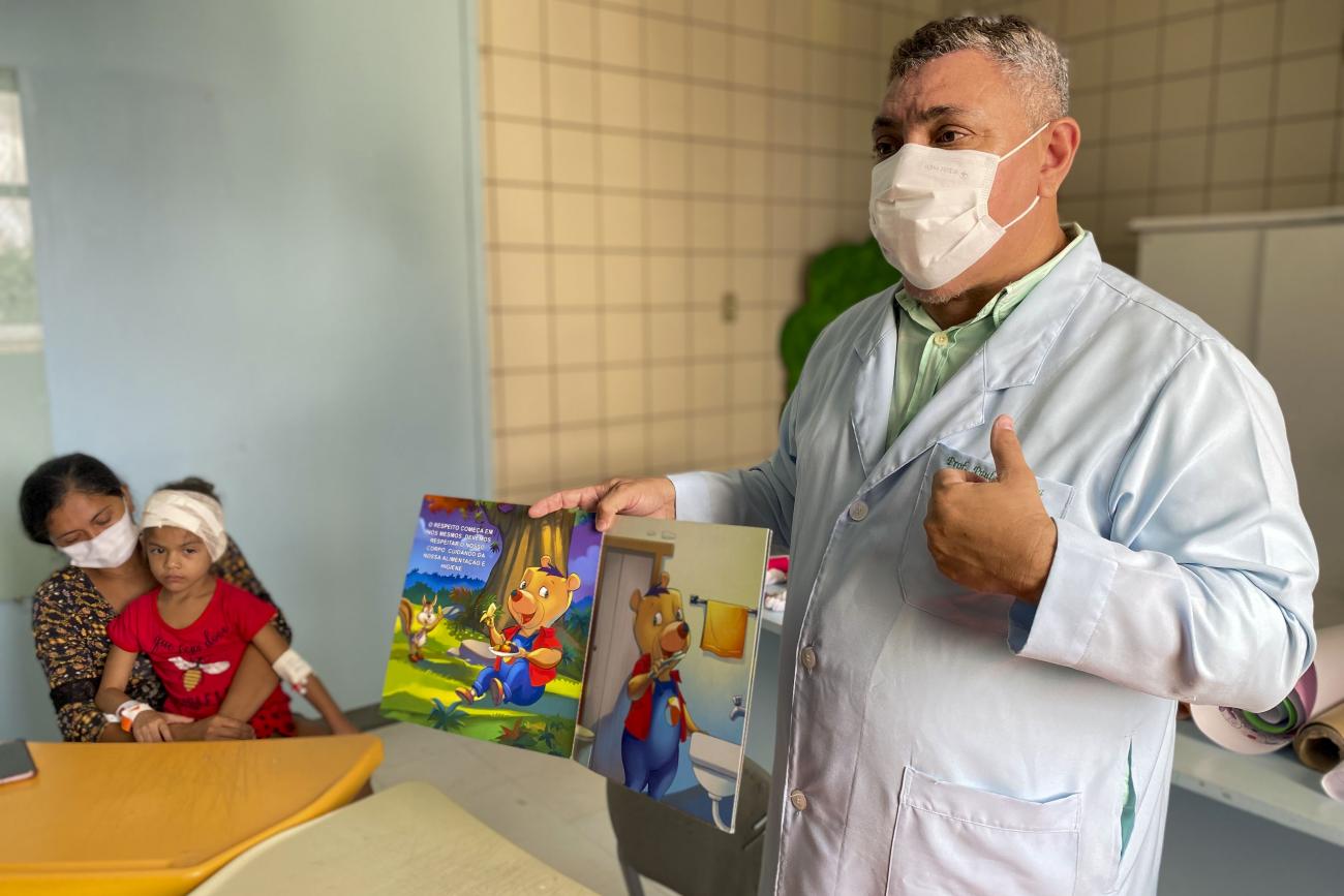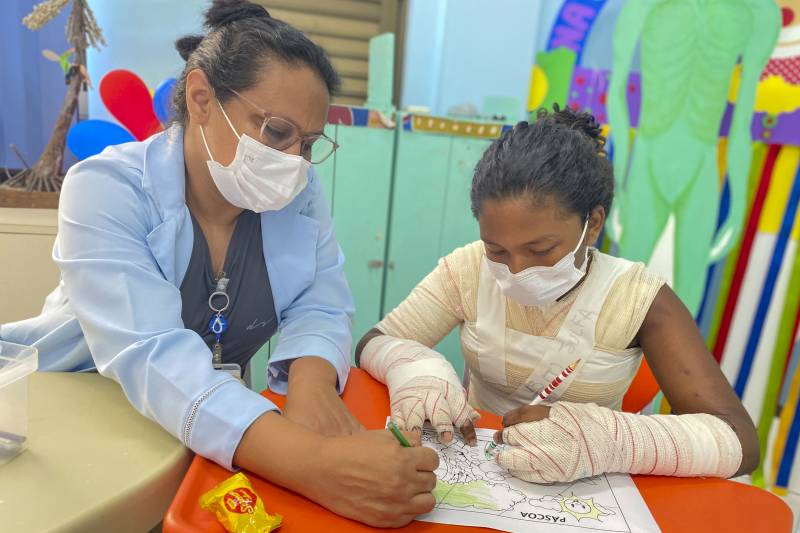 Maria Cleidinalva é de Marituba, Região Metropolitana de Belém, e mãe de Ádria Celeste, de cinco anos. Juntas, elas participaram da atividade. “Eu nunca imaginei que teríamos isso aqui dentro. Foi bom porque no leito ficamos entediados, e aqui foi diferente. Ela sorriu, eu participei com ela. Isso é muito positivo”, diz a mãe da menina.