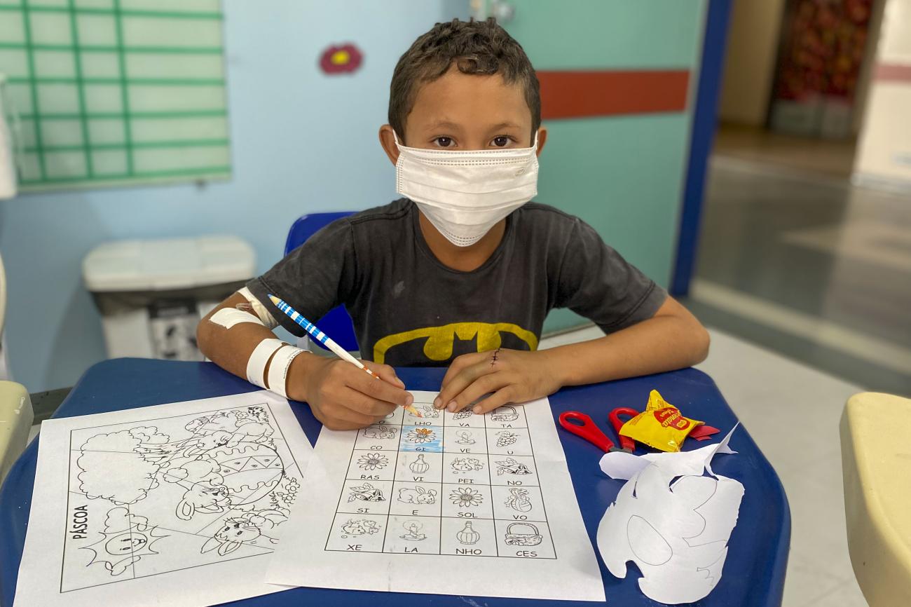 Em celebração da Páscoa, crianças internadas no Hospital Metropolitano de Urgência e Emergência (HMUE), que estudam na Classe Hospitalar da unidade, em Ananindeua, participaram de atividade especial, nesta quinta-feira (14).