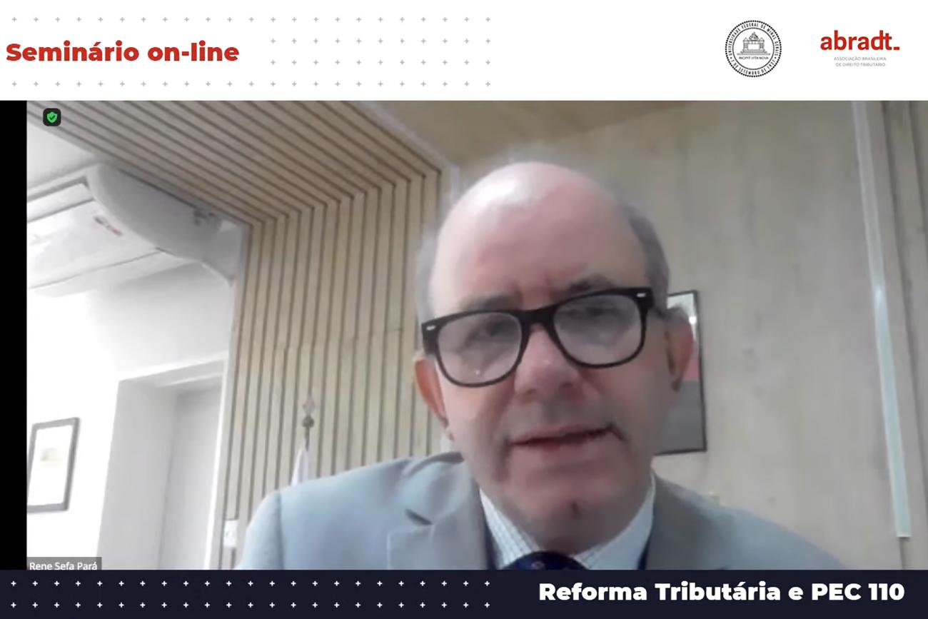 O secretário da Fazenda do Pará (Sefa), René Sousa Júnior, participou da discussão de um evento on-line nesta quinta-feira (28), organizado pela Universidade Federal de Minas Gerais e a Associação Brasileira de Direito Tributário, que discutiu a Reforma Tributária no Brasil e a PEC 110, debatendo as premissas para a reforma da tributação do consumo no Brasil, e abordando pontos relevantes da Proposta de Emenda à Constituição (PEC) 110/2019, que hoje tramita na Comissão de Constituição, Justiça e Cidadania do Senado Federal.