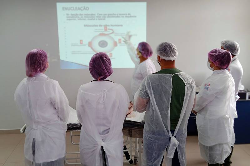 "Aprendemos na prática a técnica da enucleação, que é a retirada da córnea em perfeito estado para doação. Simulamos o procedimento cirúrgico em uma cabeça de porco e conhecemos as etapas necessárias para que o processo seja realizado com êxito até o doador", explicou.