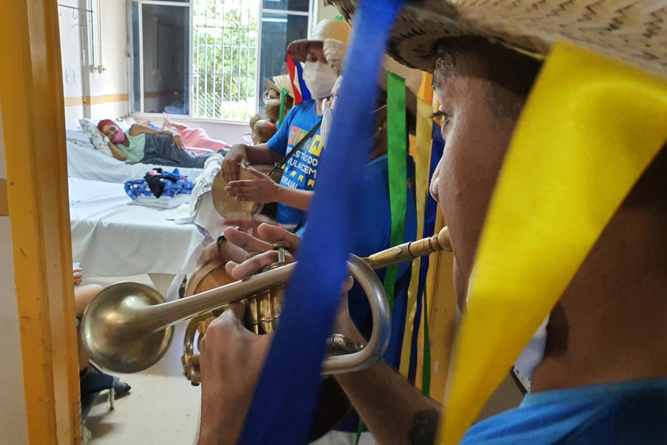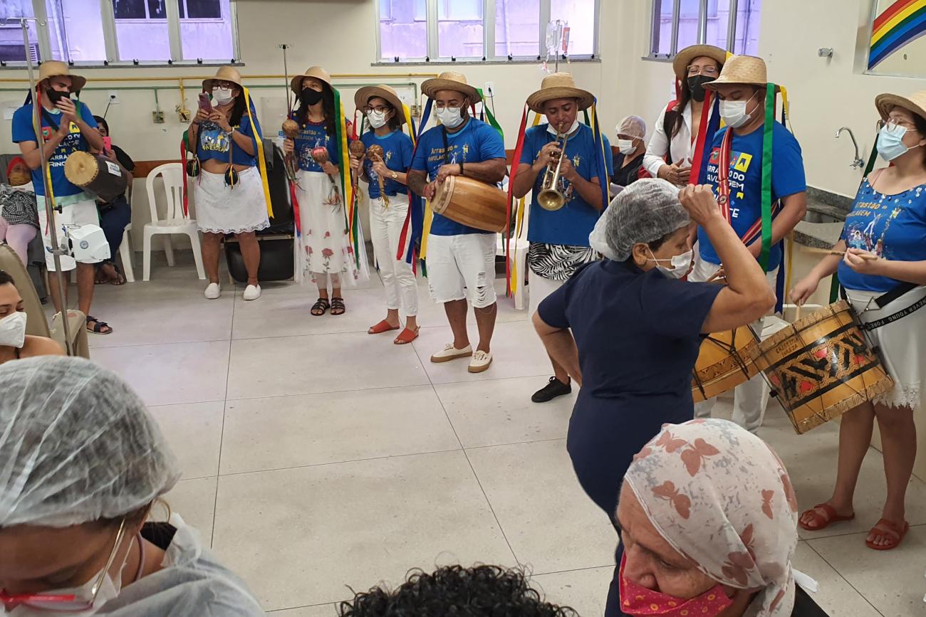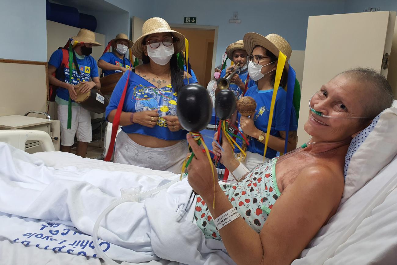 A realização de parcerias com voluntários na elaboração de programações socioculturais é preocupação constante da gestão. Iniciativas da Divisão buscam amenizar dores física, emocional, social e ocupacional, e contribuem para melhor adesão ao tratamento, principalmente em casos de hospitalização de longa permanência. Visivelmente emocionada, Maria de Nazaré Teodoro, de 57 anos, era só gratidão. Ao lado da filha Thaís, ela acompanhou o cortejo da porta de uma das enfermarias. “Eu amei a presença do arraial e até chorei de tanta emoção. É bom descontrair e dançar ao som deles. Eu gosto muito quando tem isso no hospital, anima muito o nosso dia”, afirmou.