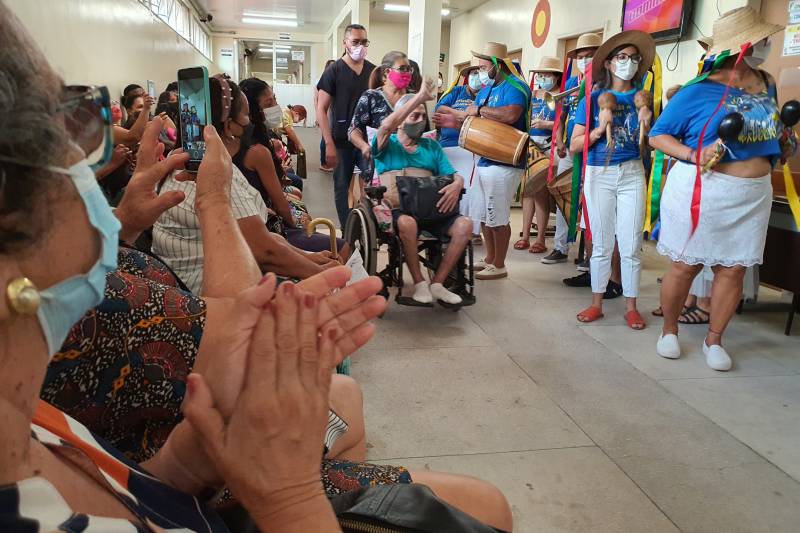 Maria das Graças Reis, de 72 anos, está internada há 14 dias no HOL e transbordava animação no cortejo, com gestos de quem vestia uma saia imaginária longa e rodada. “Eu estava lá no outro lado do hospital (se referindo a outra enfermaria), mas eu vim acompanhar e dançar com eles aqui também. A música deles me carregou e não tive como me segurar, dancei mesmo”, disse a aposentada enquanto dançava e rodava com as mãos para cima, aplaudindo os profissionais da música.