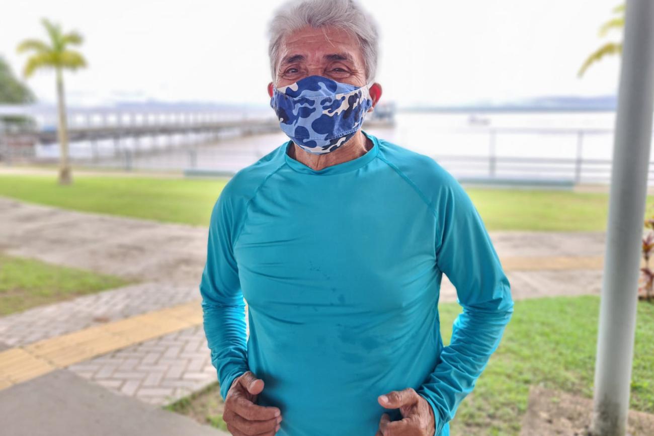 Aposentado, Luiz Otávio integra o grupo da canoagem há dois anos e, mesmo com a baixa visão, rema pra frente no barco da sua vida história de Belém e seus monumentos na orla da cidade”.