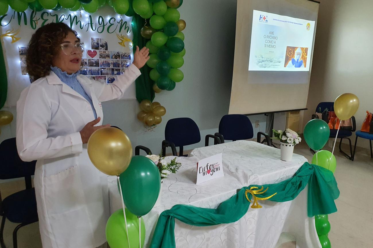 A técnica de enfermagem Lucineia Brito compartilha vivências com colegas de profissão“Não tem como exercer a profissão sem pensar na qualidade e na responsabilidade do cuidar do outro que, certamente, é o amor da vida de alguém. O reconhecimento aos profissionais da saúde veio como um abraço apertado, daquele que tanto queríamos dar, mas, por respeito às normas de segurança, adiamos”, lembrou a auxiliar de enfermagem Lucineia Brito, durante discurso emocionado aos colegas do CTI. O encontro, realizado no auditório do setor de Radioterapia, foi marcado por relatos de coragem e homenagens a colegas que deram suas vidas para salvar tantas outras.