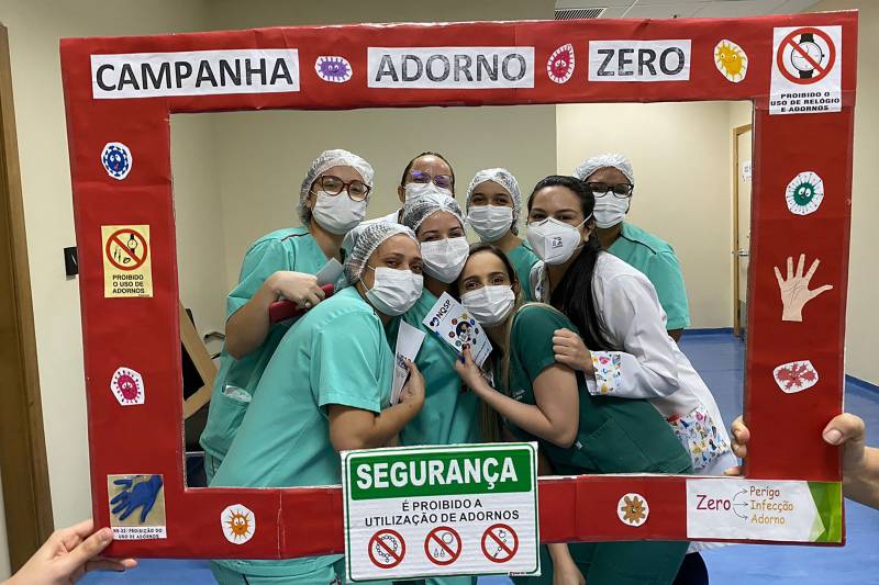 A eliminação de adornos pelos servidores do hospital durante o atendimento de saúde é outro aspecto da campanha para evitar infecções A supervisora do Serviço de Controle de Infecção Hospitalar (SCIH) do HRAS, Ligia Pereira, destaca o mês como muito importante para a promoção das ações. “Ao longo de maio, a comissão, em conjunto com outros setores, como o NSP (Núcleo de Segurança do Paciente) e Sesmt (Serviço Especializado em Engenharia e em Medicina do Trabalho) está desenvolvendo várias atividades no hospital, de caráter lúdico, educativas, incentivando a higienização das mãos. Dentre elas, destacamos o big fone da higienização, com a participação dos colaboradores”, explicou.