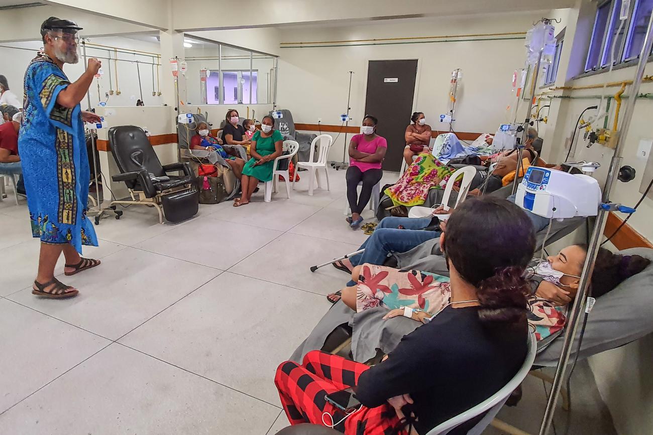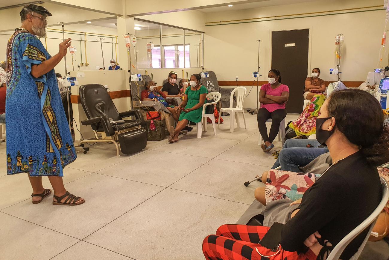 Estratégia - Na oncologia, a terapia ocupacional atua, dentre outras possibilidades, na promoção da qualidade de vida dos pacientes e na humanização dos atendimentos. É por meio dessa especialidade que os profissionais criam estratégias e atividades lúdicas, a fim de minimizar dores. “Na atividade de hoje, os pacientes puderam conhecer o trabalho do Kadu, que é um ator incrível. Ele trouxe para o ambiente hospitalar textos que promovem a nossa cultura e valorizam a nossa linguagem. A forma como ele contou as histórias fez com que a gente mergulhasse nesse contexto amazônico”, afirmou a terapeuta e chefe da Divisão de Terapia Ocupacional do HOL, Márcia Nunes.