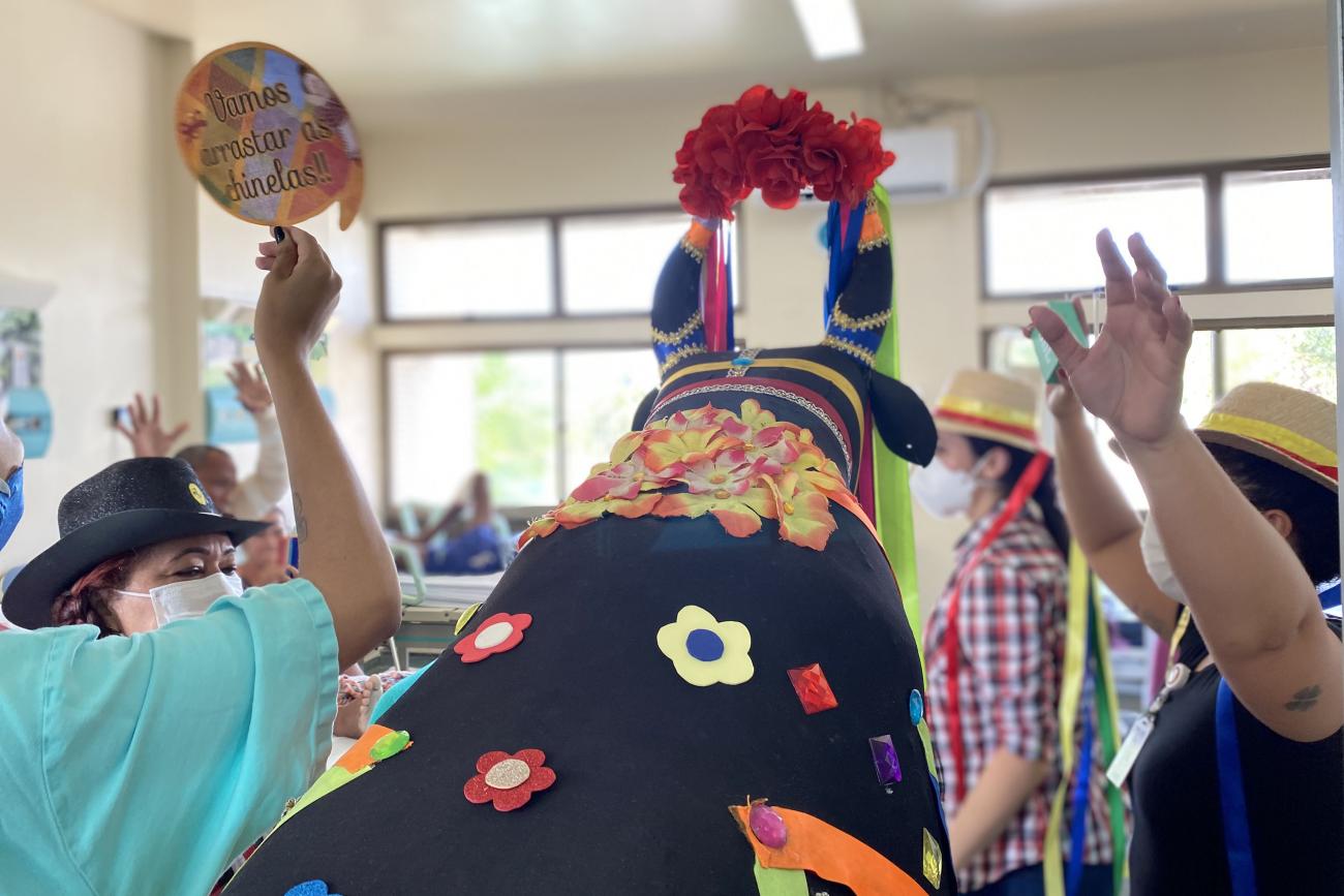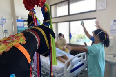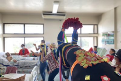 Um cortejo junino levou mais alegria às clínicas de internações do Hospital Metropolitano de Urgência e Emergência (HMUE), localizado em Ananindeua, na manhã da última segunda-feira (13). A unidade, que faz parte da rede de saúde pública do Governo do Pará e é gerenciada pela Pró-Saúde, ganhou um colorido especial nos corredores para dar passagem ao cortejo do Boi, que representa e celebra o período junino.