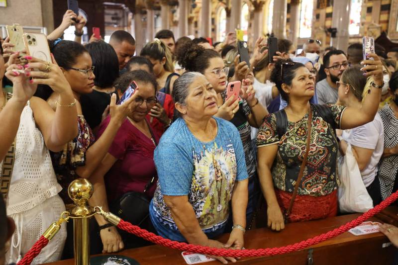Junto aos fiéis, o governador Helder e a primeira-dama Daniela Barbalho acompanham a cerimônia: "bênçãos a todos os lares"O governador Helder Barbalho e a primeira-dama, Daniela Barbalho, acompanharam a cerimônia. “É um momento único, em que a gente pode estar perto da imagem de Nossa Senhora de Nazaré, um momento de conversa, momento de reflexão e gratidão. E esse momento muito especial, de voltar ao Círio, em que as pessoas estão nas ruas, podendo confraternizar. Momento de agradecer para que Maria continue a proteger o povo do Pará, da Amazônia e do Brasil. Que continue derramando bençãos a todos os lares”, afirmou o governador.