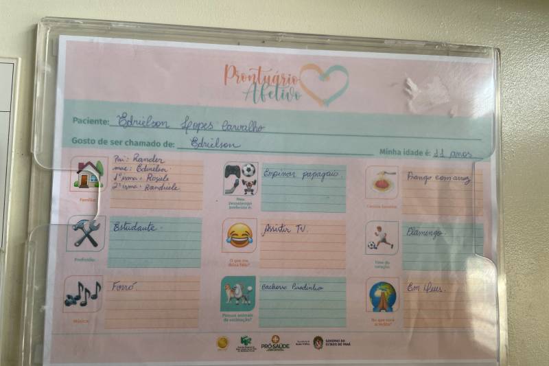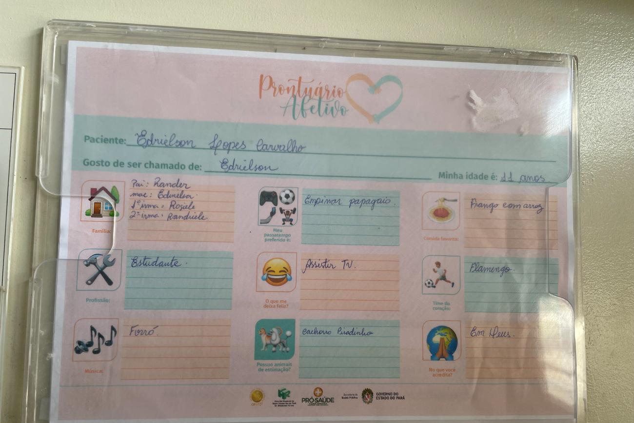 Todas estas informações ficam próximas ao leito do menino e dos outros pacientes internados nas clínicas pediátrica e oncológica da unidade, que pertence ao Governo do Estado do Pará e é gerenciada pela entidade filantrópica Pró-Saúde. O prontuário afetivo dá a oportunidade de os colaboradores conhecerem melhor as crianças e as famílias que são atendidas pela unidade, humanizando o atendimento.