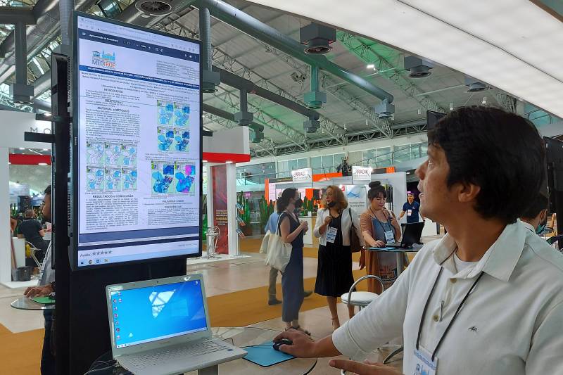 Bruno Pinheiro mostra um dos trabalhos científicos expostos no Medtrop