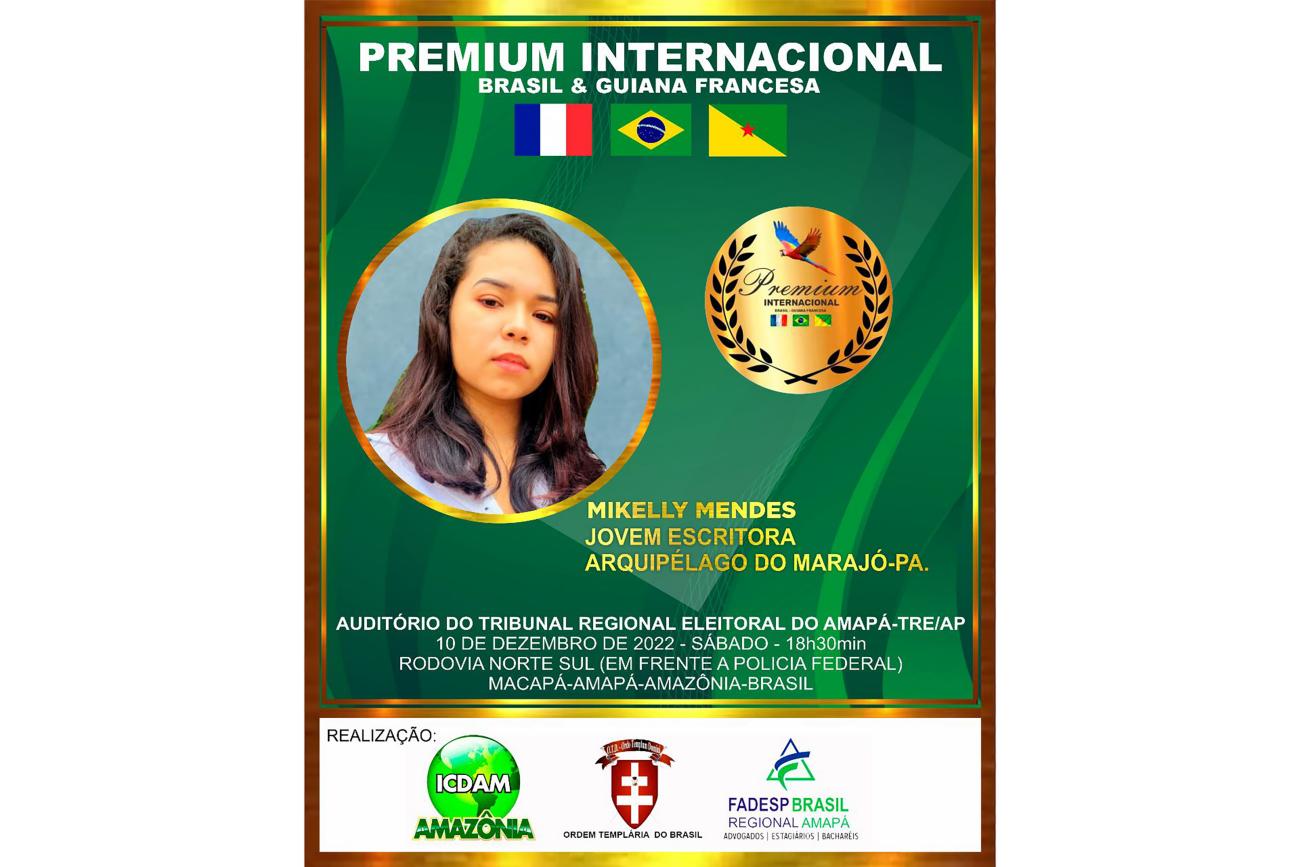 Internacional - Mikelly Mendes também receberá, no dia 10 de dezembro, em Macapá (AP) o Premium Internacional Brasil & Guiana Francesa, uma realização do ICDAM Amazônia, Ordem Templária do Brasil e Fadesp Brasil - Regional Amapá, que vai contemplar com Honra ao Mérito 120 protagonistas por suas contribuições para o desenvolvimento da Amazônia, dentre eles: autoridades políticas, ativistas culturais, personalidades públicas, profissionais da comunicação, defensores do meio ambiente e empreendedores.