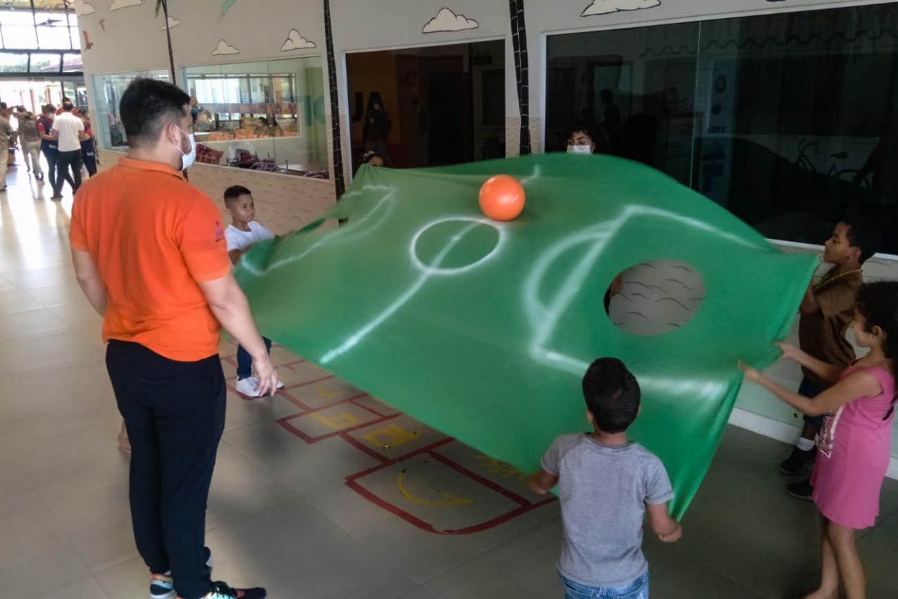 Maria Souza e o neto se divertem antes de atendimento do usuário. “Alinhando o útil ao agradável, no momento da espera no atendimento, a criança possa a se distrair com a atividade. É uma espécie de aquecimento para quem vai à terapia. Com a Copa em evidência, e hoje sendo mais um jogo do Brasil, trouxemos essa atividade de recreação”, pontuou Nathália Nanci, recreadora do Arte e Cultura.