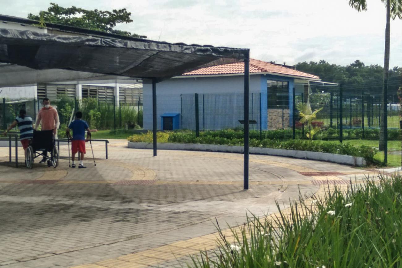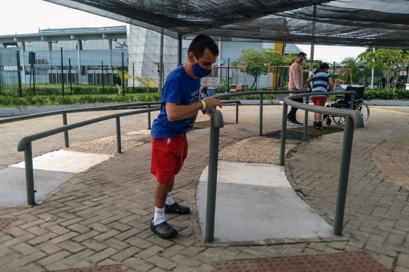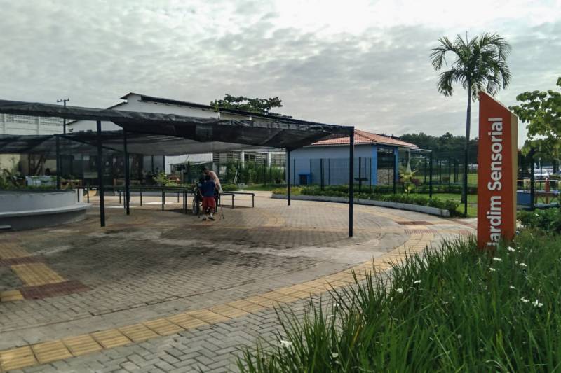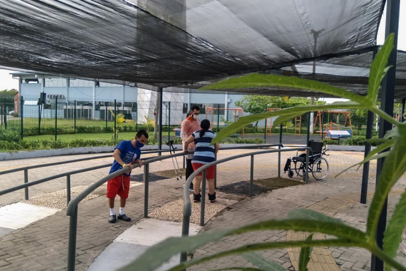 O espaço do Jardim Sensorial tem diferentes pisos. Similar a realidade que eles vivem ou irão conviver nas calçadas das ruas, após concluírem as reabilitações. Não é um terreno plano. Tudo com o intuito de preparar todos eles para enfrentar os percalços do dia a dia. “A lateralidade da caminhada é o processo de abdução, pois eles andam sempre de frente. É estimular a andar de lado, tudo agregando com objetos, como a caneleira (as tradicionais de academia), barras fixas e cones”, explica Samuel Pacheco, pontuando que os participantes são escolhidos de acordo com o perfil clínico.