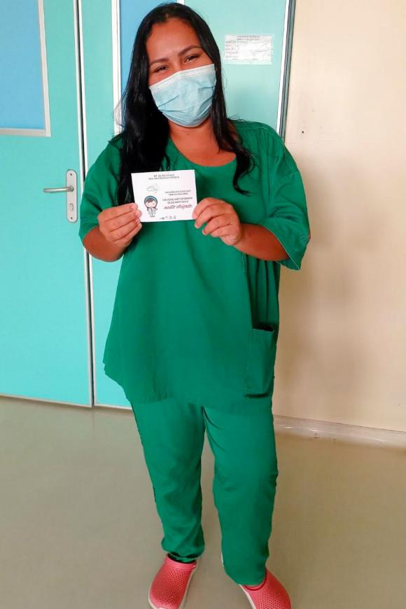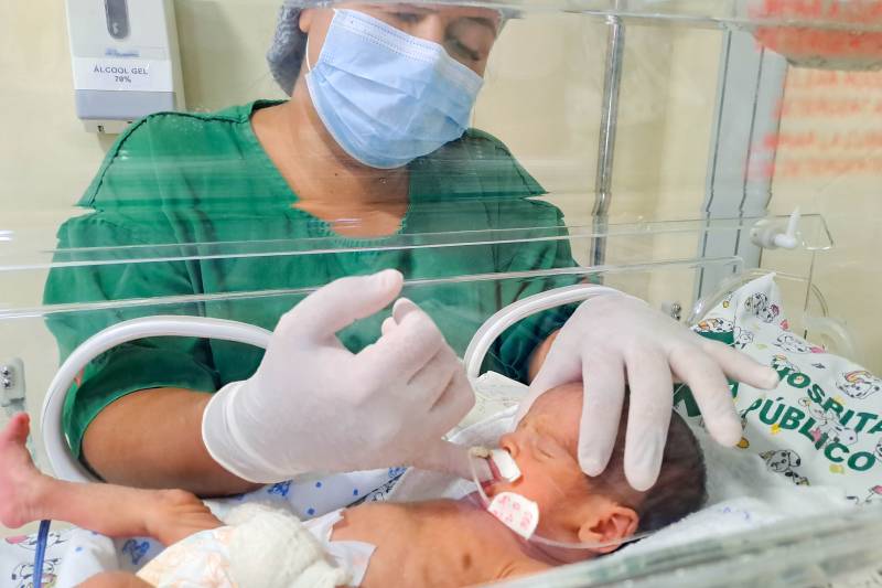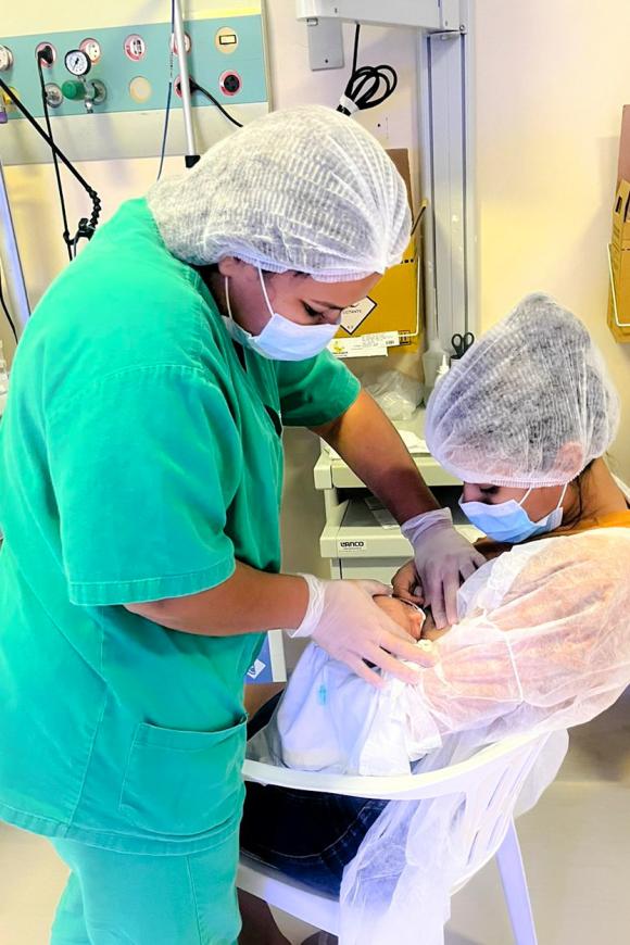 Internado na Clínica Neonatal há 20 dias, o recém-nascido Kleber de Oliveira, prematuro com 34 semanas e 1.419kg, filho de Elanne Lima de Oliveira, residentes no rio Camarapi, na zona rural do município de Portel, está no momento usando sonda alimentar como via alternativa de alimentação, por isso, necessita do suporte da fonoaudióloga para que possa se alimentar via oral, no seio materno e em livre mamada. “Para que isso aconteça, preciso estimular a sucção não nutritiva e sucção nutritiva, até que ele esteja pronto para sugar no seio materno”, explicou  o fonoaudióloga.