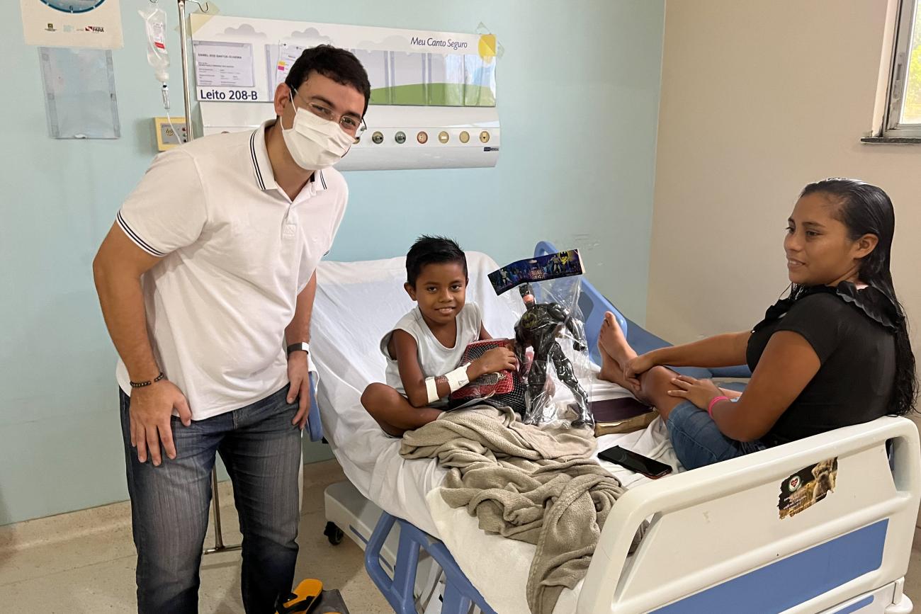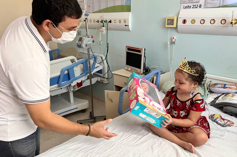 Davi Emanuel Pereira, de 9 anos, ficou muito feliz com sua caminhonete preta: "Que Deus dê muita saúde a todos", desejou.A véspera de Natal foi de muita alegria para os pequeninos do Hospital Oncológico Infantil Octávio Lobo (Hoiol), em Belém. Representando o governador do Pará, Helder Barbalho, e a primeira-dama, Daniela Barbalho, o auditor-geral do Estado, Arthur Houat, realizou, na manhã deste sábado (24), a entrega de presentes aos pacientes da instituição gerenciada pelo Instituto Diretrizes.