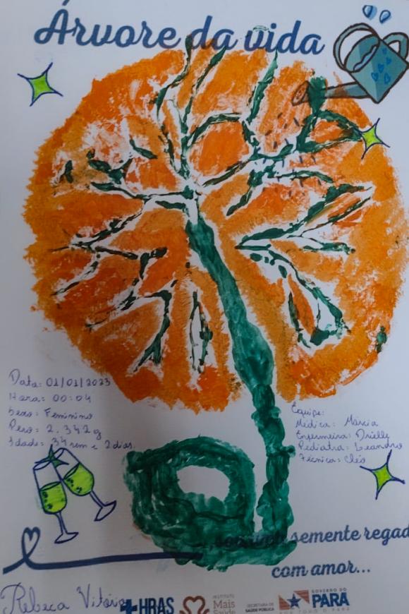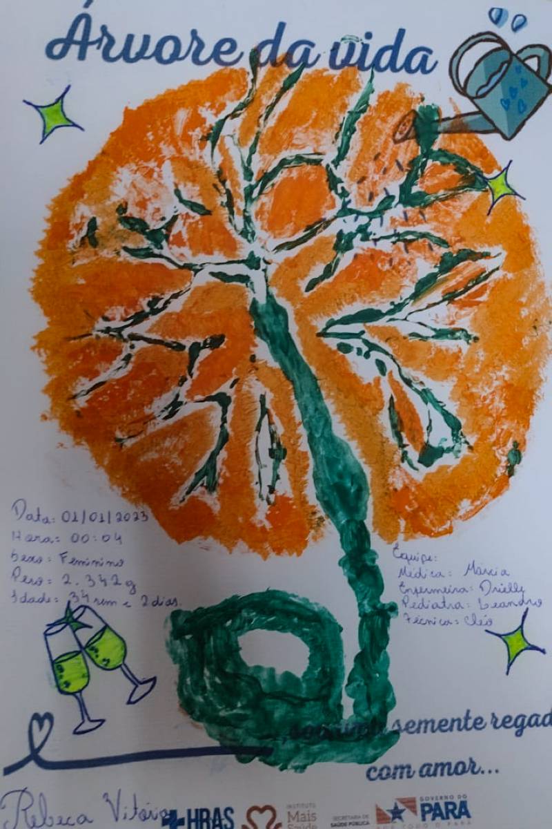 Entusiasmo- O nascimento do primeiro bebê do HRAS, em 2023, também foi celebrado pela equipe que estava de plantão na noite do Réveillon. E como forma de eternizar esse momento, Rebeca Vitória levará para casa a pintura da placenta de sua mãe, onde foi sua primeira 'casa' durante a gestação. A iniciativa faz parte do Projeto Árvore da Vida. "Para celebrar esse momento tão especial, que é o nascimento de um bebê, após o parto, as famílias ganham um carimbo da placenta da mãe. O objetivo ainda, é deixar o parto mais humanizado e fortalecer o elo entre mãe e filho", explicou Thalita Beltrão, enfermeira obstétrica do HRAS.