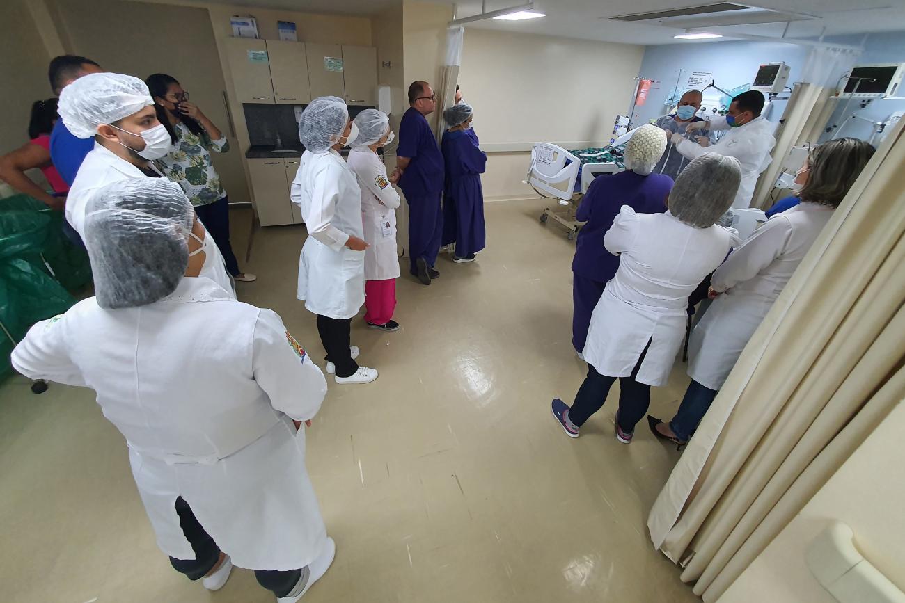 A Divisão de Fisioterapia do Hospital Ophir Loyola (HOL) realizou, na última quarta-feira (11), treinamento com parte da equipe da Unidade de Terapia Intensiva da instituição. A capacitação ocorreu na UTI 4 e abordou, dentre vários assuntos, o posicionamento correto do circuito respiratório e cuidados com o paciente durante o banho, reconhecendo e avaliando o movimento e a fragilidade de cada usuário.