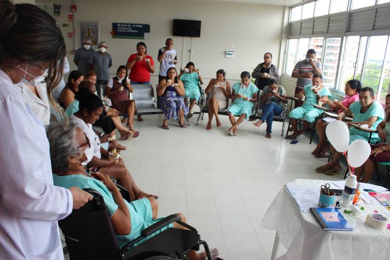 A equipe multiprofissional do Hospital de Clínicas Gaspar Vianna (HC), em Belém, na manhã desta quinta-feira (19) promoveu uma roda de conversa sobre saúde mental e a importância do autocuidado para a qualidade de vida. De forma lúdica e interativa, pacientes e acompanhantes receberam orientações sobre temas relevantes, como cuidados com a alimentação, importância da interação social e organização de uma rotina.