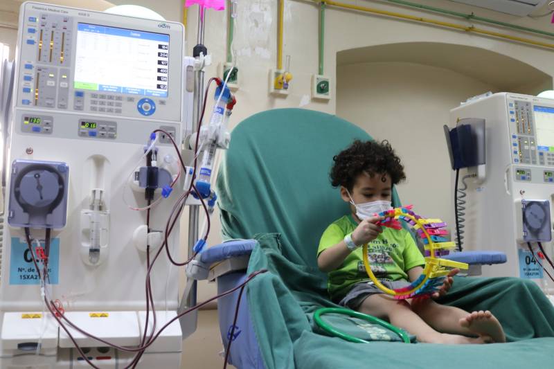 Atendimento à criança que precisa de diáliseA aposentada Maria do Socorro Dias Monteiro mora em Tomé-Açu, município do nordeste paraense, com o neto Felipe Walace, 14 anos. Uma vez por mês eles vêm à capital para Felipe faça o acompanhamento na Santa Casa. "A gente vem desde que ele era criança. Ele nasceu prematuro em Tomé-Açu, e aqui em Belém foi que descobriram a fissura no palato. Chegou a precisar de traqueostomia e sonda, mas hoje está bem. Ele sempre passa por aqui pelo atendimento de fono, psicologia e odonto. O Hospital é uma maravilha. Ele tem vontade até de vir porque gost; o tratamento é muito bom", garante a avó de Felipe.