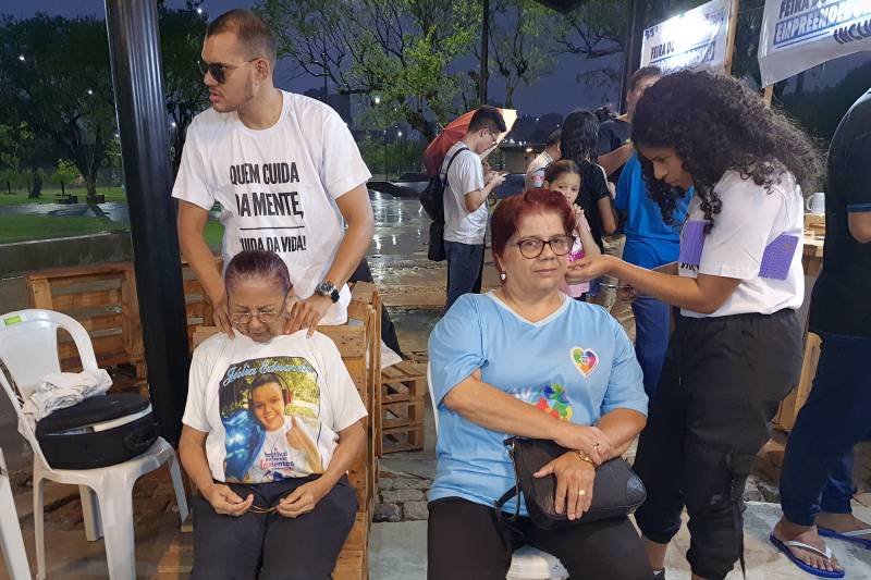 Quem passou pelo local na tarde de hoje pôde receber, ainda, os serviços de massagem e auriculoterapia, aromaterapia, verificação de pressão arterial e glicemia. A paisagista e artesã Maria José Neves Barros tirou um tempinho do trabalho para fazer a massagem e verificar a pressão. “Eu achei muito bom esse serviço de massagem aqui. Nem sempre a gente tem uma oportunidade de fazer, principalmente quando temos que lidar com os filhos e netos de tem o espectro autista. No caso, a minha neta não me dá tempo para fazer esse tipo de coisa”, explicou a vendedora.