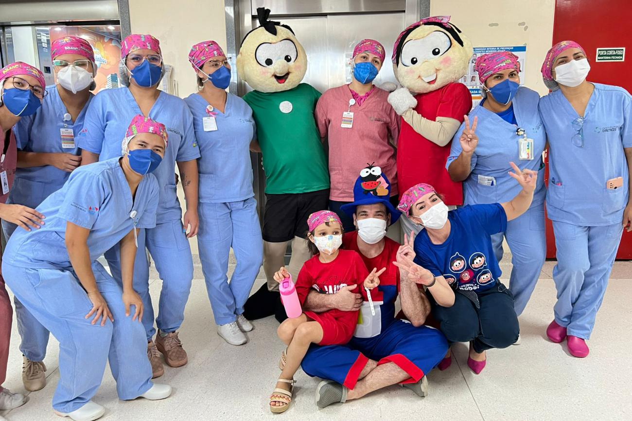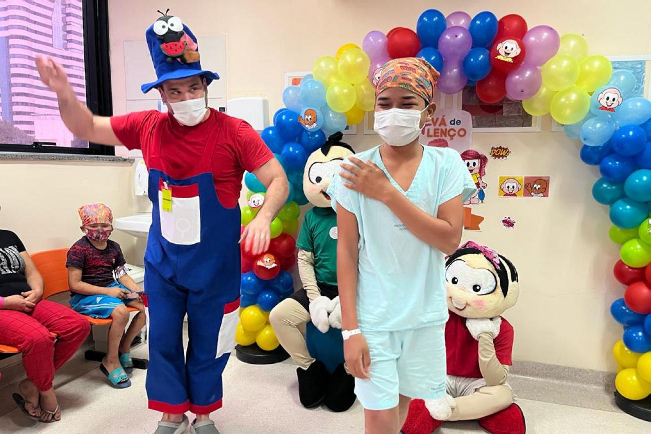 Crianças e responsáveis no Hospital Octávio Lobo na programação da campanha “Vá de Lenço” O Hospital Oncológico Infantil Octávio Lobo (Hoiol) aderiu à campanha “Vá de Lenço”, promovida pela Associação Brasileira de Linfoma e Leucemia (Abrale), em alusão ao Dia Mundial do Câncer, celebrado neste sábado (4). A 7ª edição da campanha conscientiza sobre a prevenção e a importância do diagnóstico precoce do câncer, e também homenageia pacientes que enfrentam a doença. Uma ação realizada, na sexta-feira (3), fez referência ao Projeto Dodói e contou com a presença da representante da Abrale, Edna Mcphee, do cantor Guto Risuenho e dos personagens Mônica e Cebolinha.