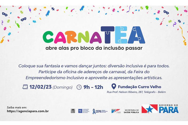 “Abre Alas pro Bloco da Inclusão Passar” é o tema do CarnaTea, primeiro bailinho de carnaval organizado pela Secretaria de Estado de Saúde Pública (Sespa), por meio da Coordenação Estadual de Políticas para o Autismo (Cepa). O evento será realizado no domingo (12), na Fundação Curro Velho, das 9 às 12h.