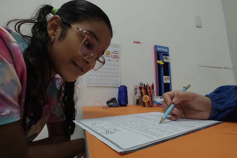 Thaila Vera, de 10 anos, é uma das reabilitandas que está em desenvolvimento no plano terapêutico com o suporte da psicopedagogia. Segundo a mãe, Tais Vera, de 28 anos, a menina, atualmente, já demonstra socialização com as pessoas e aperfeiçoamento cognitivo na vida escolar. “Minha filha evoluiu bastante. Na chegada dela aqui, em setembro do ano passado, apresentava dificuldade para falar, mas agora ela já interage com as pessoas e também melhorou a escrita. Tudo de acordo com o método utilizado pela profissional”.