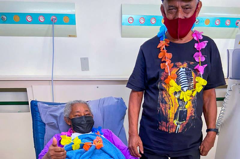 Dona Leonor e seu acompanhante não deixaram de participar da folia carmavalesca Entre as beneficiadas com a festinha surpresa do carnaval está usuária Leonor Ferreira dos Santos, de 77 anos, que reside em Gurupá, na área do rio Ipixuna. “Foi bonito, uma experiência nova pra mim porque nunca tinha participado de carnaval, só via pela televisão, gostei bastante. Todos estão de parabéns", disse.