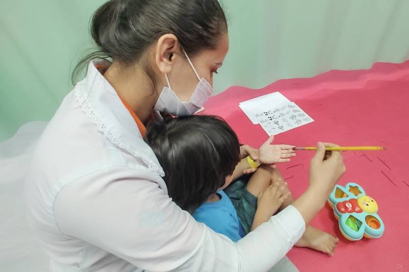 “O Gabriel apresenta dificuldades, mas aos poucos, a gente vai conseguindo quebrar as barreiras para futuramente adaptá-lo às atividades, principalmente, relacionadas à escola para melhorar a escrita; ajudá-lo a pintar de forma coordenada. Para isso, a terapia é planejada visando força e tato”, explica.