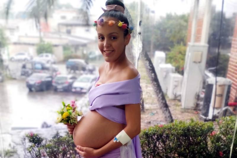 Laís de Oliveira durante ensaio. Mayra Lopes, de 17 anos, está internada há um mês no Hospital de Clínicas. Para ela, o momento foi eternizado por meio de fotos. “As fotos servirão como uma boa lembrança da minha gravidez. Foi muito bom poder participar, me arrumar. Gostei muito”, ressaltou Mayra, que irá passar por uma cesariana nos próximos dias.
