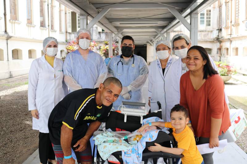 Antonio e família junto a equipe multidiciplinar que realizou os cuidados paliativos na UTI pediátricaPara que João Pedro pudesse realizar o sonho de ver o irmãozinho, a psicóloga realizou também um atendimento individualizado para o menino. "Foi feito uma preparação terapêutica com a criança visitante, através de recursos lúdicos, onde pudesse expressar seus sentimentos e expectativas, compreender o que estava acontecendo ao seu redor, elaborar fantasias e preparar a criança para nova experiência”, detalha a psicóloga. Com todos os cuidados tomados, o resultado foi até melhor do que o esperado, conta a mãe, Thoyá Negrão.