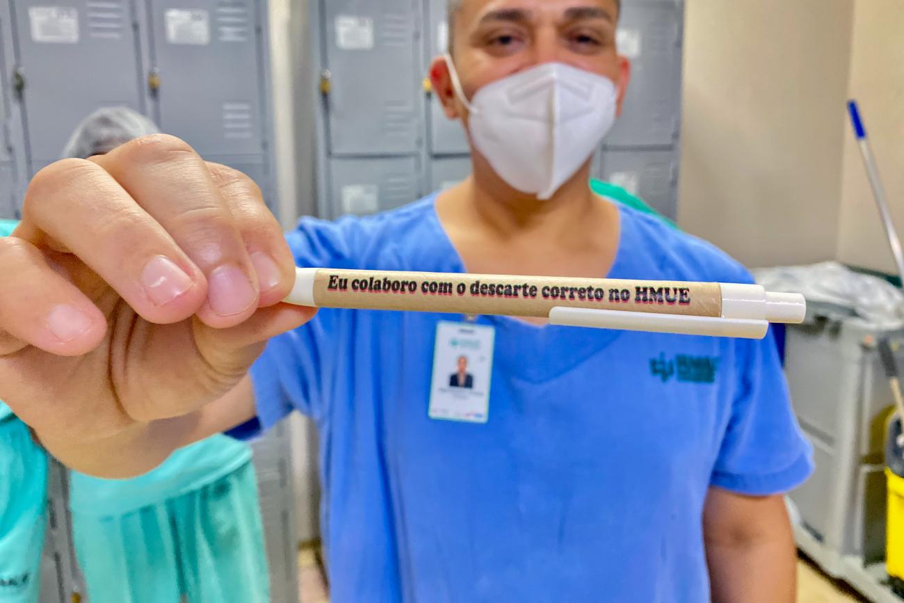 A programação contou com demonstração prática, exposição e palestras em todos os setores do HMUE, feitas por membros do comitê do PGRSS e profissionais do Serviço Especializado em Segurança e Medicina do Trabalho (Sesmt) e os participantes receberam canetas feitas com produtos totalmente recicláveis.